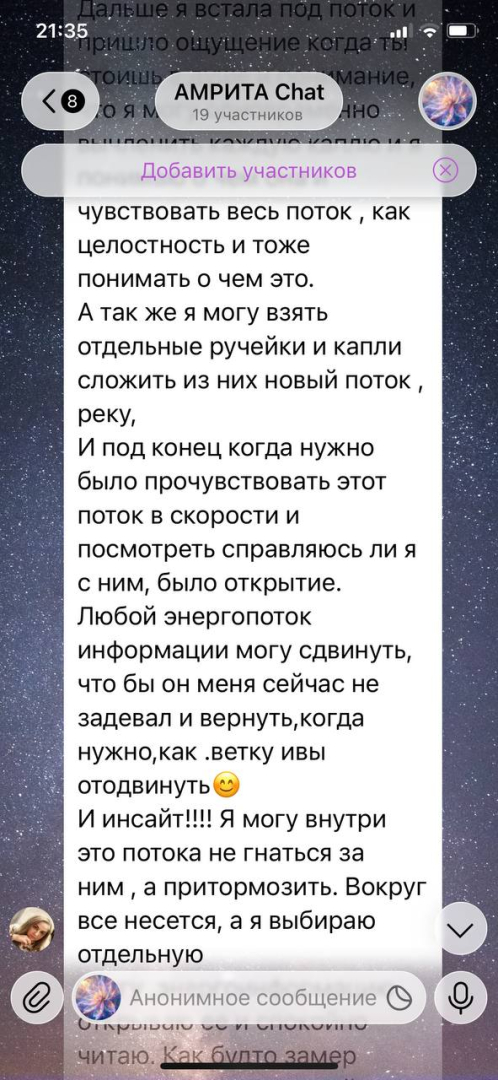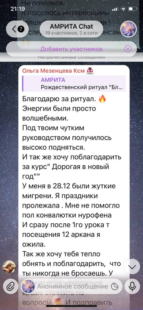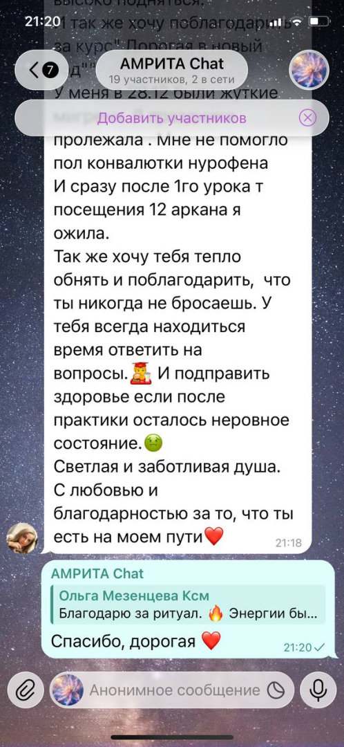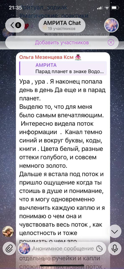 Огромная благодарность Максимилиану за очередной глубокий и сильный курс "Сборка Личности" в г. Москва. Мощные практики и грамотное структурное построение занятий, как всегда, принесли свой прекрасный результат! Сошлись многие пазлы многолетних наработок по взаимодействию с Союзниками. Прописалась четкая конструкция соотношения между ядром Личности и подсознанием. Выстроились правильные и гармоничные энергетические потоки, усиливающие непосредственно саму Личность и поле Союзников. Спасибо магическому эгрегору, каждому участнику группы и прекрасным организаторам за безупречную работу! До новых магических встреч.Наталья Лазарева изменил фотографию своего профиляНаталья Лазарева подписался на Ваше Творчество Магистру- Ваше Творчество Магистру